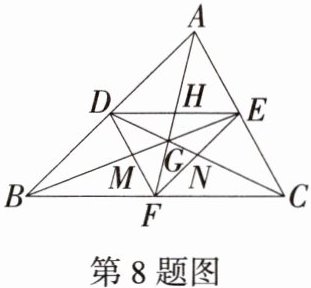 8. 教材变式 「2025 福建泉州永春二模,」如图,在△ABC 中,D,E,F 分别是边 AB,AC,BC 的中点,AF,CD,BE 相交于点 G,AF,BE,CD 分别与 DE,DF,EF 相交于点 H,M,N,若 AF = 18$\sqrt{5}$,则 GH 的长为(