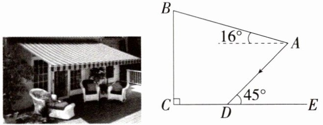 8. 「2024甘肃甘南州中考,」某校数学兴趣小组通过对如图所示的靠墙的遮阳篷进行实际测量,得到以下数据:遮阳篷$AB长为5m$,与水平面的夹角为$16^{\circ}$,且靠墙端离地高$BC为4m$,当太阳光线$AD与地面CE的夹角为45^{\circ}$时,求阴影$CD$的长.(参考数据:$\sin16^{\circ}\approx0.28$,$\cos16^{\circ}\approx0.96$,$\tan16^{\circ}\approx0.29$)