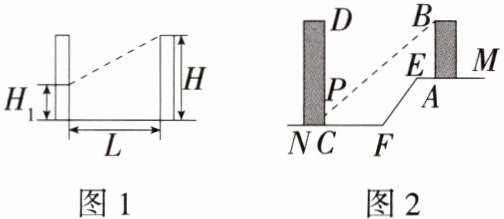 9. 新 课标应用意识“日照间距系数”反映了房屋日照情况.如图1,当前后房屋都朝向正南时,日照间距系数$= L:(H - H_1)$,其中$L$为楼间水平距离,$H$为南侧楼房高度,$H_1$为北侧楼房底层窗台至地面高度,如图2,山坡$EF$朝北,$EF长15m$,其坡度为$1:0.75$,山坡顶部平地$EM上有一高为24.3m的楼房AB$,底部$A到E点的距离为5m$.欲在$AB楼正北侧山脚的平地FN上建一楼房CD$,已知该楼底层窗台$P处至地面C处的高度为1.1m$,要使该楼的日照间距系数不低于$1.25$,底部$C距F$处至少多远?