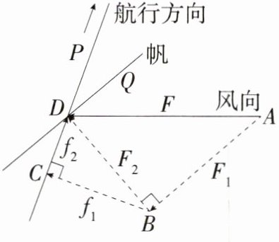 7. 跨物理力的分解「2024福建中考,」无动力帆船是借助风力前行的.如图所示的是帆船借助风力航行的平面示意图,已知帆船航行方向与风向所在直线的夹角$\angle PDA为70^{\circ}$,帆与航行方向的夹角$\angle PDQ为30^{\circ}$,风对帆的作用力$F为400N$.根据物理知识,$F可以分解为两个力F_1与F_2$,其中与帆平行的力$F_1$不起作用,与帆垂直的力$F_2又可以分解为两个力f_1与f_2$,$f_1$与航行方向垂直,被舵的阻力抵消,$f_2$与航行方向一致,是真正推动帆船前行的动力.在物理学上常用线段的长度表示力的大小,据此,建立数学模型:$F = AD = 400$,则