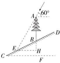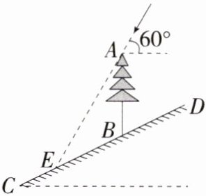 6. 「2024四川眉山中考,」如图,斜坡$CD的坡度i = 1:2$,在斜坡上有一棵垂直于水平面的大树$AB$,当太阳光与水平面的夹角为$60^{\circ}$时,大树在斜坡上的影子$BE的长为10$米,则大树$AB$的高为______米.