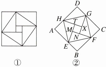 5. 勾股定理被记载于我国古代的数学著作《周髀算经》中,汉代数学家赵爽为了证明勾股定理,创制了一幅如图①所示的“弦图”,后人称之为“赵爽弦图”,图②是由弦图变化得到的,它是由八个全等的直角三角形拼接而成的,记图中正方形$ABCD$,正方形$EFGH$,正方形$MNXT的面积分别为S_{1},S_{2},S_{3}$,若$S_{1}+S_{2}+S_{3}= 24$,求正方形$EFGH$的面积.