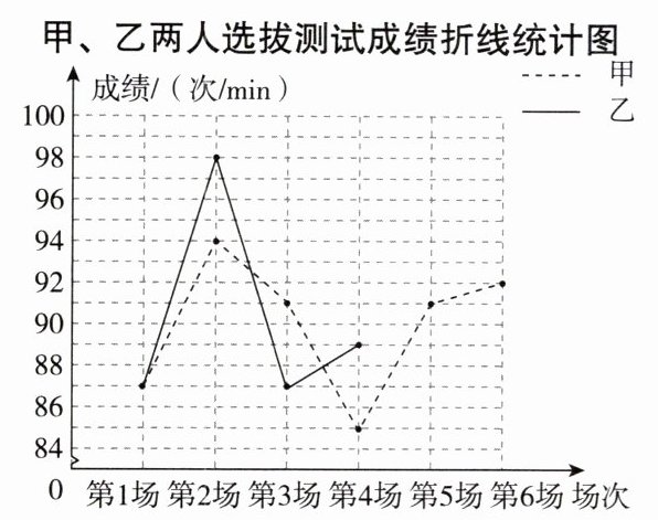 7. 某班要从甲、乙两名同学中选拔出一人,代表班级参加学校的1min踢毽子体能素质比赛,在一段时间内的相同条件下,甲、乙两人进行了六场1min踢毽子的选拔测试,根据他们的成绩绘制出如下的统计表和不完整的折线统计图.