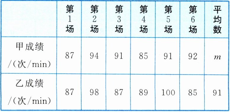 (4)①选甲参赛更有把握夺冠。理由:在六场比赛中,甲有四场比赛成绩超过90次/min,而乙只有二场,且甲的方差小于乙的方差,成绩更稳定,故选甲参赛更有把握夺冠。