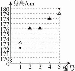 5. 学校篮球场上初三(1)班5名同学正在投篮比赛,将场上5名队员的身高绘制成如图所示的统计图,其中“△”是换人前5名队员的身高,“●”是换人后5名队员的身高,与换人前相比,换人后场上队员的身高(