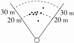 4. 2024·常州 新考法·图形信息题 小丽进行投掷标枪训练,总共投掷10次,前9次标枪的落点如图所示,记录成绩(单位:m),此时这组成绩的平均数是20m,方差是$s_{1}^{2}$.若第10次投掷标枪的落点恰好在20m线上,且投掷结束后这组成绩的方差是$s_{2}^{2}$,则$s_{1}^{2}$