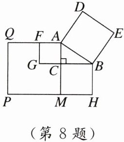 8. 欧几里得的《几何原本》中给出一种证明勾股定理的方法.如图,在$\triangle ABC$中,$\angle ACB= 90^{\circ}$,四边形$ABED$、四边形$ACGF$、四边形$BCMH和四边形AMPQ$都是正方形.若$\triangle ABC$的面积为3,正方形$ABED$的面积为13,则正方形$AMPQ$的面积为 (