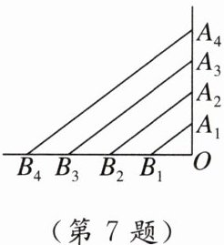 7. 情境题生活应用 斜拉桥是我国流行的桥型之一,大跨径斜拉桥已居世界第一.如图,$OA_{1}= A_{1}A_{2}= A_{2}A_{3}= A_{3}A_{4}$,$OB_{1}= B_{1}B_{2}= B_{2}B_{3}= B_{3}B_{4}$,如果最长的钢索$A_{4}B_{4}= 80m$,那么钢索$A_{2}B_{2}$,$A_{1}B_{1}$的长分别是 (