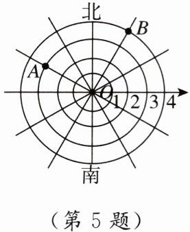 5. [2025郴州二模]如图所示为雷达图,规定:1个单位长度代表100m,以点$O$为原点,过数轴上的每一刻度点画同心圆,并将同心圆平均分成十二等份.一艘海洋科考船在点$O处用雷达发现A,B$两处鱼群,那么$A,B$两处鱼群的距离是 (
