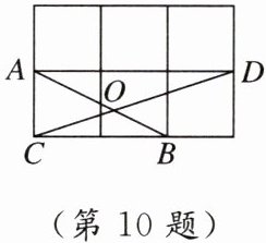 10. 如图所示的是$3×2$的正方形网格,每个小正方形的顶点称为格点.线段AB,CD的端点均在格点上,且交于点O,则$∠BOD$的度数为 ( )