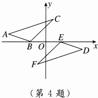 4. 如图,$△ABC$经过两次轴对称(x轴和y轴为对称轴)变化后,得到$△DEF$,如果A,B,C各点的坐标分别为$A(-5,1),B(-2,0),C(1,3)$,那么D,E,F各点的坐标分别为D