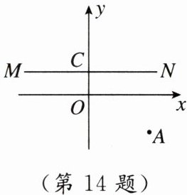 14. 如图,在直角坐标系中,点A的坐标为$(3,-2)$,直线$MN// x$轴且交y轴于点$C(0,1)$,则点A关于直线MN的对称点的坐标为( )
