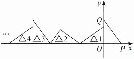 $-4050$ 【点拨】由题意得从$\triangle_1$的直角顶点到$\triangle_3$的直角顶点经过的路程恰好为$\triangle OPQ$的周长,即$2+\frac{3}{2}+\frac{5}{2}=6$,故$\triangle_3$的直角顶点的横坐标为$-6$,$\triangle_4$的直角顶点的横坐标为$-6$。