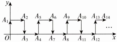 1. 在平面直角坐标系中,一个动点A从原点O出发,按向上、向右、向下、向右的方向依次不断移动,每次只移动1个单位长度,其行走路线如图所示.