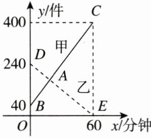 3. [2025太原迎泽区月考]某快递公司每天下午15:00~16:00为集中揽件和派件时段,甲仓库用来揽收快件,乙仓库用来派发快件,如图,线段BC,DE分别表示甲仓库、乙仓库的快件数量$y_{1},y_{2}$(件)与揽件(或派件)时间x(分钟)之间的函数关系,线段BC,DE相交于点A.