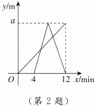 2. [2025聊城月考]小王同学从家出发,步行到离家a m的公园晨练,4 min后爸爸也从家出发沿着同一路线骑自行车到公园晨练,爸爸到达公园后立即以原速折返回到家中,两人离家的距离y(单位:m)与出发时间x(单位:min)的函数关系如图所示,则两人先后两次相遇的时间间隔为(