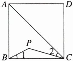 5. 如图,点P是正方形ABCD内位于对角线AC下方的一点,$∠1= ∠2$,则$∠BPC$的度数为______