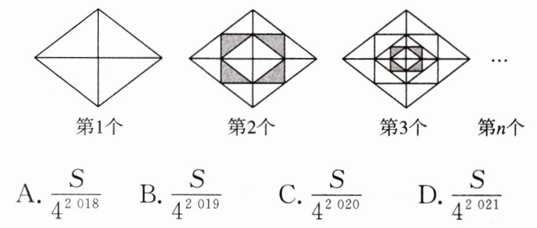 10. 学科素养 逻辑推理 如图,在一组由菱形和矩形组成的图案中,第1个图中菱形的面积为S(S为常数),第2个图中阴影部分是由连接菱形各边中点得到的矩形和再连接矩形各边中点得到的菱形产生的,…,以此类推,则第2020个图中阴影部分的面积可以用含S的代数式(S≥2且S是正整数)表示为(