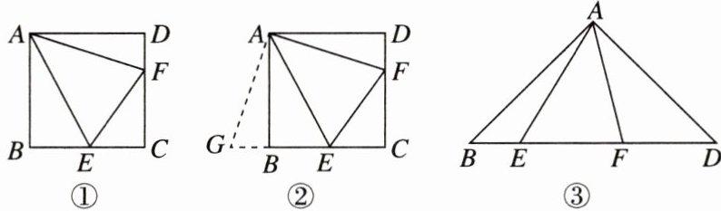 3. (新视角 新定义题) 如图①, 四边形 ABCD 是正方形, E, F 分别在边 BC 和 CD 上, 且 $ \angle EAF = 45^\circ $, 我们把这种模型称为“半角模型”, 在解决“半角模型”问题时, 旋转是一种常用的方法. 小明为了了解线段 EF, BE, DF 之间的关系, 将 $ \triangle ADF $ 绕点 A 顺时针旋转 $ 90^\circ $ 后 (如图②) 解决了这个问题.