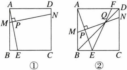 问题探究: 在“问题情境”的基础上, 如图②, 若垂足 P 恰好为 AE 的中点, 连接 BD, 交 MN 于点 Q, 连接 EQ 并延长, 交边 AD 于点 F, 求 $ \angle AEF $ 的度数.