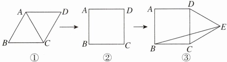 5. [2024昭通一模]如图,有六根长度相同的木条,小明先用四根木条制作了能够活动的菱形学具,他先将该活动学具调成如图①所示的菱形,测得$∠B= 60^{\circ }$,连接AC,$AC= 10cm$,接着将该活动学具调成如图②所示的正方形,最后用剩下的两根木条搭成了如图③所示的图形,连接BE,则图③中$\triangle BCE$的面积为( )