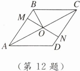 12. 如图,在菱形ABCD中,M,N分别在AB,CD上,且$AM= CN$,MN与AC交于点O,连接BO,若$∠DAC= 28^{\circ }$,则$∠OBC$的度数为____