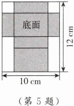 5. 如图所示的是一张长12cm、宽10cm的矩形铁皮,将其剪去两个全等的正方形和两个全等的矩形,剩余部分(阴影部分)可制成底面积是$24cm^{2}$的有盖的长方体铁盒. 则剪去的正方形的边长为