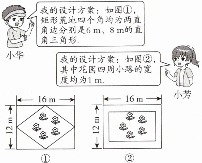 10. 情境题 情景对话 要在一块长16m、宽12m的矩形荒地上建造一个花园,要求花园面积是荒地面积的一半,下面分别是小华与小芳的设计方案.