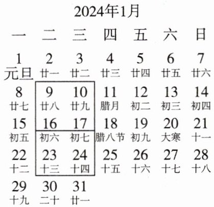 10. 新趋势 文化传承 下图是2024年1月的日历,1月1日下方标有“元旦”二字,“元旦”意为“初始之日”,中国历史上的“元旦”指的是农历“正月初一”,1949年中华人民共和国以公历1月1日为元旦.在如图所示的日历中,用“日”形框框住任意6个数,若其中最小数与最大数的乘积为100,求这个最小数.
