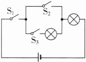 9. 新趋势·跨学科 2024·珠海香洲区模拟 如图,电路连接完好,且各元件工作正常.随机闭合开关$S_{1}$,$S_{2}$,$S_{3}$中的两个,能让两个小灯泡同时发光的概率为 ( )