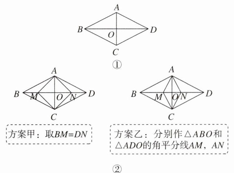 5. 如图①,在菱形ABCD中,对角线AC,BD相交于O,要在对角线BD上找两点M,N,使得四边形AMCN是菱形,现有图②中的甲、乙两种方案,则正确的方案是(