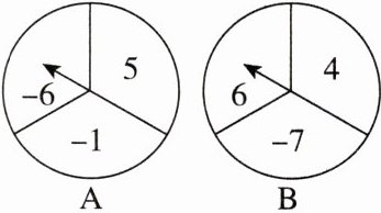 14. (18分)(母题教材P73复习题T8)如图,A,B两个带指针的转盘分别被分成三个面积相等的扇形,转盘A上的数分别是-6,-1,5,转盘B上的数分别是6,-7,4(两个转盘除表面上的数不同外,其他完全相同).小聪和小明同时转动A,B两个转盘,使之旋转(规定:指针恰好停留在分界线上,则重新转一次).