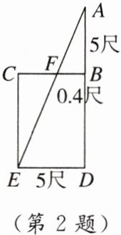2. [2024漳州龙海区期末]我国古代数学著作《九章算术》中的“井深”问题:“今有井径五尺,不知其深,立五尺木于井上,从木末望水岸,人径四寸,问井深几何”,它的题意是:如图,AB= DE= 5尺,BF= 0.4尺,问井深BD是(
