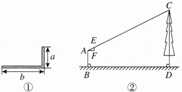 1. [2023北京石景山区期末]如图①,“矩”在古代指两条边成直角的曲尺,它的两边长分别为a,b.中国古老的天文和数学著作《周髀算经》中简明扼要地阐述了“矩”的功能:“平距以正绳,偃矩以望高,覆矩以测深,卧矩以知远,环矩以为圆,合矩以为方”.其中“偃矩以望高”的意思就是把“矩”仰立放可测物体的高度.如图②,从“矩”AFE的一端A望向树顶端的点C,使视线通过“矩”的另一端E,测得BD= 8m,AB= 1.6m.若“矩”的边EF= a= 30cm,边AF= b= 60cm,则树高CD为(