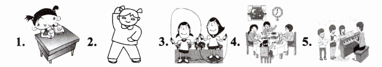 A. homework B. sports C. lunch D. running E. ping-pong F. the pipa G. kung fu H. dinner I. swimming J. shopping K. morning exercises