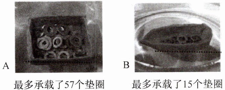 4. 下面两幅图是某小组利用相同质量的橡皮泥制作的橡皮泥小船,两艘小船空载时的重量相同,但形状不同。用同样大小的垫圈测试小船的承载能力,据图分析并回答问题: