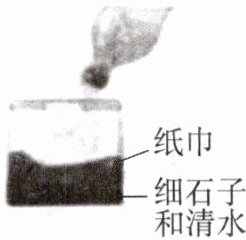 很久以前,人们使用在地上挖坑填埋的办法处理垃圾。小明做填埋垃圾模拟实验。他在广口瓶中放入淘洗干净的细石子,然后加入清水,使水刚好位于石子的一半。用镊子往瓶中靠瓶壁处放入几团浸过墨水的纸巾,用细石子埋住,再慢慢地往上面喷水(如下图)。观察瓶子底部水的颜色和清澈度的变化。