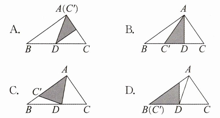 1. 在综合实践课上,同学们进行折纸活动,根据下列折纸的示意图(其中$C'$是点C的对应点),其中线段AD一定是$\triangle ABC$的中线的是 (