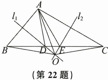 22. 如图,在$\triangle ABC$中,边AB的垂直平分线$l_{1}$交BC于点D,边AC的垂直平分线$l_{2}$交BC于点E,$l_{1}与l_{2}$相交于点O,连结AD,AE。已知$\triangle ADE$的周长为12 cm。