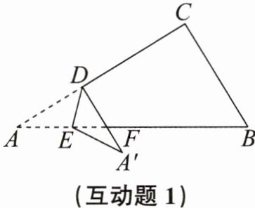 互动题1 如图,将纸片△ABC沿DE折叠,使点A落在点A'处,DA'交AB于点F。若A'D//BC,且∠B-∠A= 20°,则∠AED的度数为