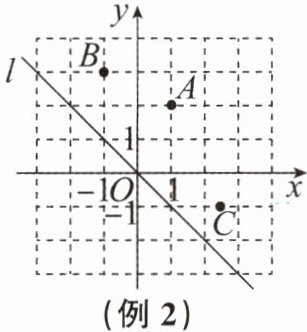 例2 (2023秋·嘉兴期末)如图,在平面直角坐标系中,已知点A(1,2),B(-1,3),C(2.5,-1),直线l是第二、四象限的平分线。