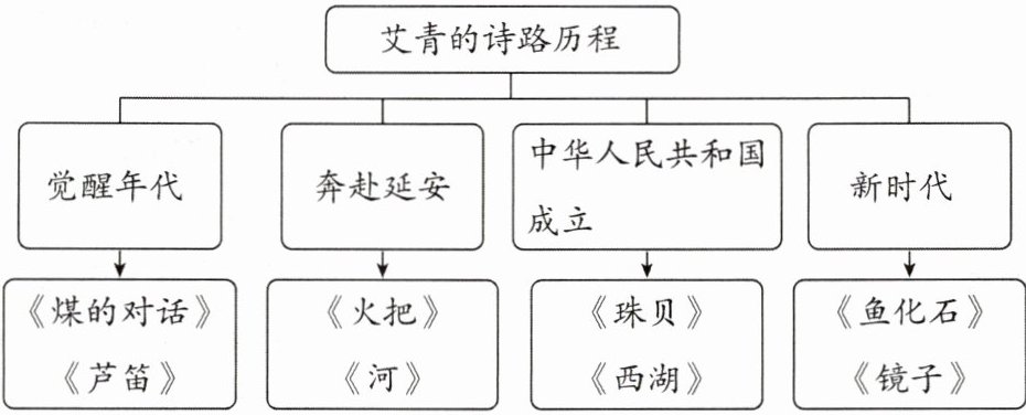 (2)艾青诗歌的风格随着时代的变化而变化。借助材料一中的思维导图,结合材料二中的《煤的对话》和《鱼化石》(节选),从内容和形式两方面探究艾青诗歌风格的变化。