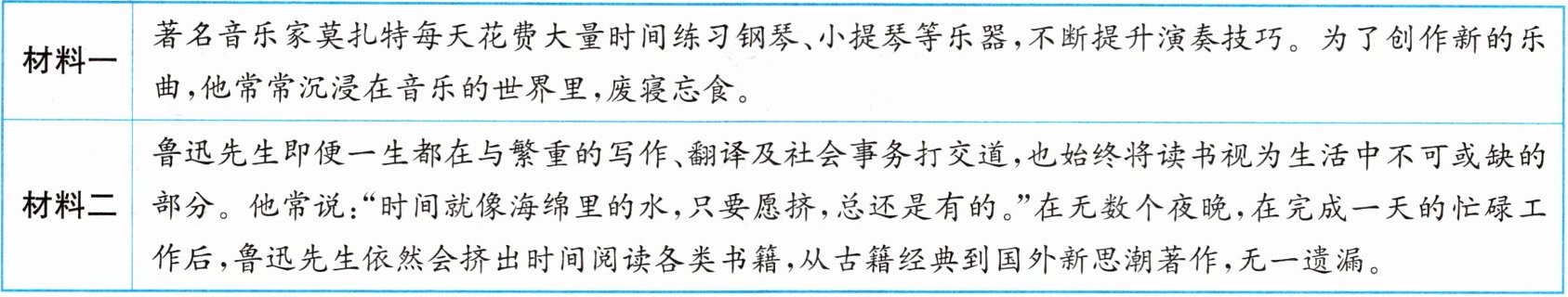 材料一 著名音乐家莫扎特每天花费大量时间练习钢琴、小提琴等乐器,不断提升演奏技巧。为了创作新的乐曲,他常常沉浸在音乐的世界里,废寝忘食。