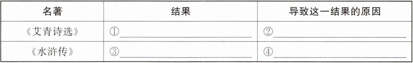 (2)①抗争带来希望和新生,迎来光明。 ②艾青诗歌中抗争对象是黑暗社会现实、民族苦难,诗人坚信正义和光明最终会到来,通过诗歌唤起人们的觉醒和抗争意识,鼓舞人们为实现光明而奋斗。 ③抗争最终失败,梁山好汉接受招安后死伤惨重,起义以悲剧告终。 ④梁山好汉抗争对象是北宋朝廷的腐败统治,但他们的“替天行道”缺乏明确的政治纲领和长远目标,且受封建思想束缚,宋江等人对朝廷抱有幻想,希望通过招安来实现自身价值,导致最终抗争