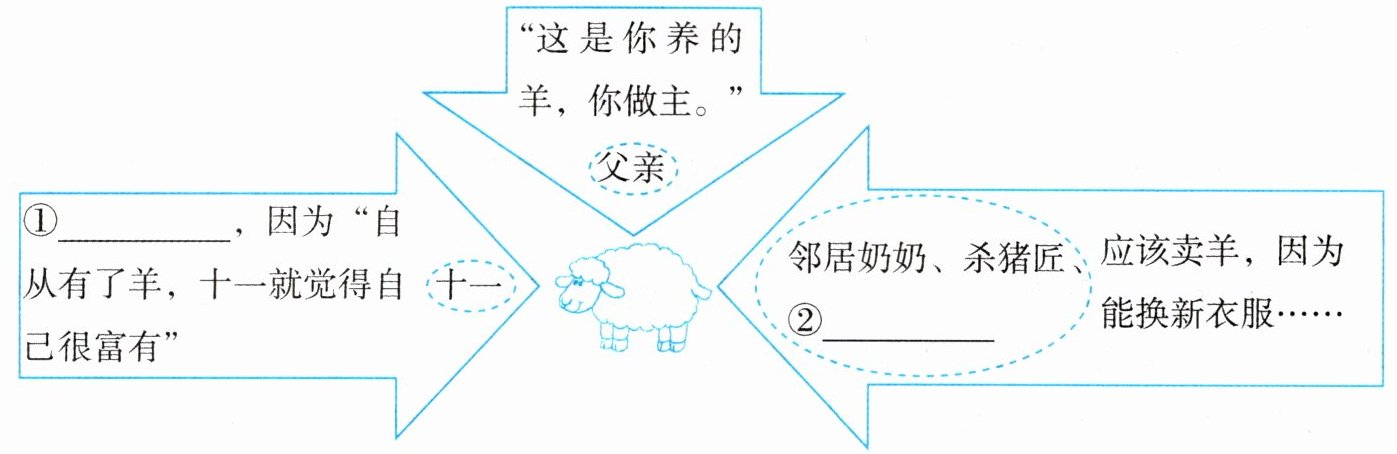 (3)情感上,羊陪伴十一,让他不再感到空洞、无聊,给他带来了快乐,他可以和羊聊天,羊成为他情感的寄托;心理上,羊被人们夸赞漂亮,让十一有了成就感和自豪感,觉得自己很了不起;生活上,有了羊之后,他的生活变得丰富有趣,不再单调地踢小石头,而是有了照顾羊的一系列活动,所以他觉得自己很富有。