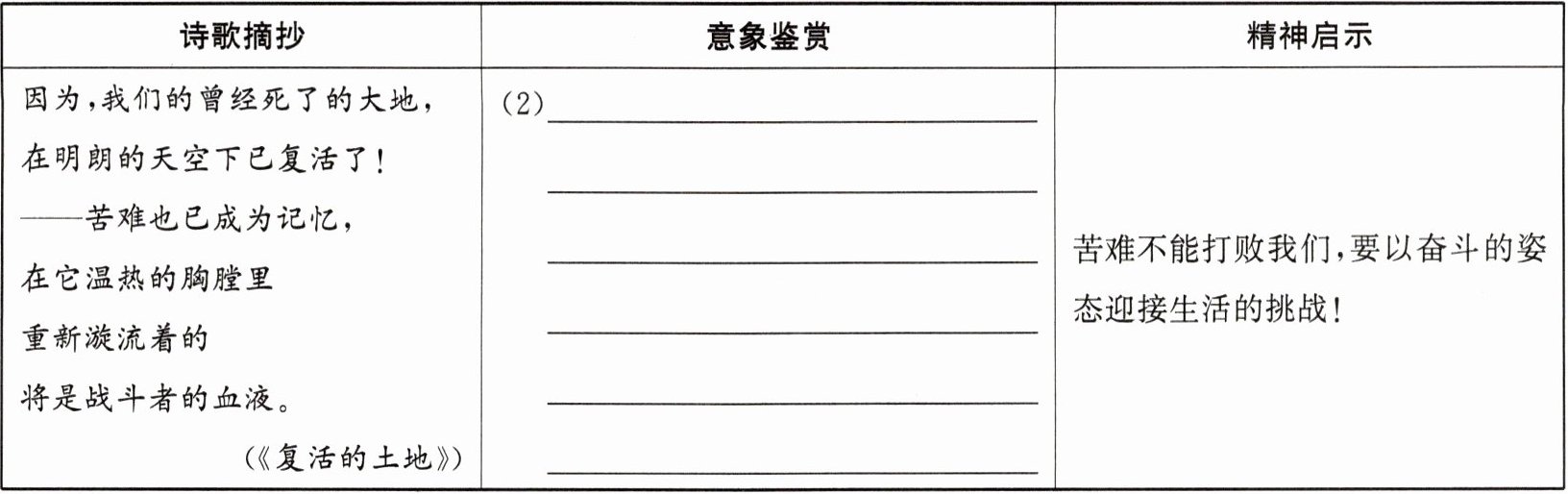 (2)“土地”象征着养育着中华民族的祖国大地,“复活”意味着它正在觉醒。表达了诗人对民族美好未来的憧憬。
