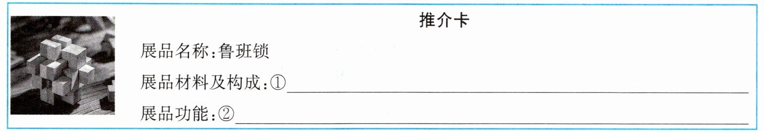 ______(2)[体验鲁班发明]鲁班纪念馆展示了许多鲁班的发明创造。为了让大家有更好的体验,场馆特别推出了“鲁班锁”作为专题展品。请你结合生活经验,补全“鲁班锁”的推介卡。