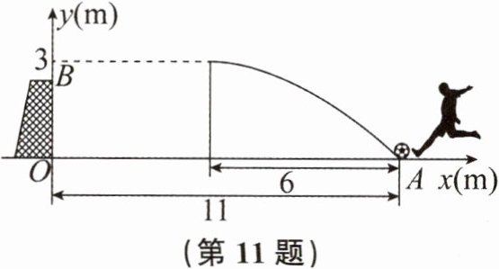 11. 一次足球训练中,小华从球门正前方11m的A处射门,足球射向球门的运行路线呈抛物线形.当球飞行的水平距离为6m时,球达到最高点,此时球离地面3m.已知球门的高$OB= 2.44m$,现以O为原点建立如图所示的平面直角坐标系.