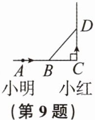 9. 如图,小明、小红两人分别从相距5km的A,C两地同时跑步出发,各自沿箭头所指方向前进.已知小明的速度是8km/h,小红的速度是6km/h,且当小明到达C地时两人停止运动,且$AC⊥CD$.出发