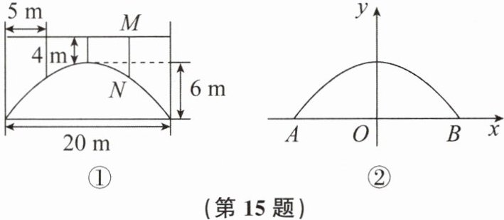 15. (10分)如图①,有一座桥拱为抛物线形的拱桥,在正常水位时,桥下的水面宽20m,拱顶到水面的距离为6m,到桥面的距离为4m,相邻两支柱间的距离均为5m,建立直角坐标系如图②所示.